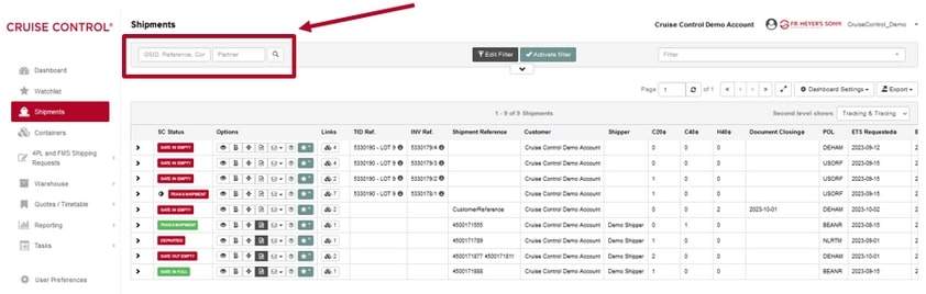 You can track you shipments in the corresponding overview page. To navigate there, use the link in your main menu. Within the overview table, you can see shipment information such as supply chain status, addresses, references, ports, departure and arrival times etc.